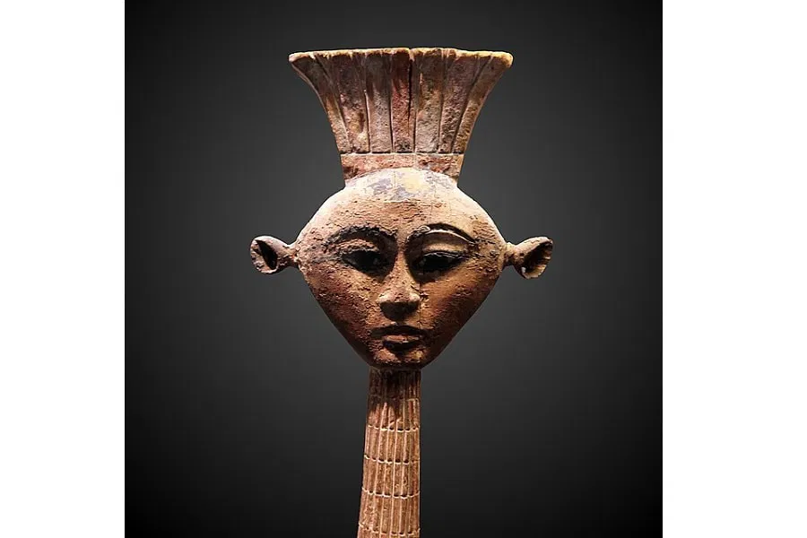 Anuket is most often depicted as a beautiful woman wearing a tall headdress crafted from reeds or ostrich feathers, symbols of fertility, grace, and connection to the river. This unique crown is also considered a nod to her Nubian heritage. She commonly carries an ankh, representing life, and a scepter that signifies authority and divine protection. In many depictions, she appears with a gazelle, her sacred animal, representing speed and elegance, or she may take the form of a gazelle herself. Artistic portrayals often emphasize her fluid, regal appearance, reflecting the dynamic movement of the Nile’s waters. In temple reliefs, she is shown suckling the Pharaoh, symbolizing her role as the divine mother and protector of kingship. Later iconography associates her with cowrie shells, symbols of fertility and sensuality, highlighting her dual connection to nurturing and desire. Her physical depiction thus embodies both the river’s vitality and the goddess’s feminine strength.