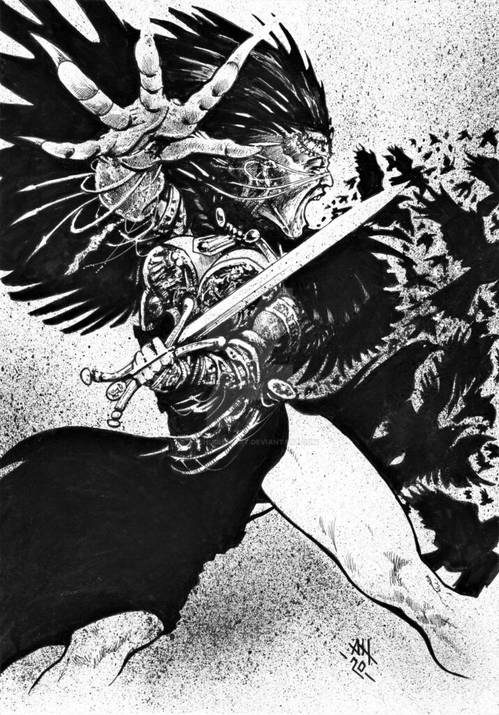 In Irish mythology, Badb (pronounced “Bive”) is one of the most haunting and powerful figures, a goddess of war, prophecy, and death who often takes the form of a crow. Her name literally means “battle crow,” and she appears on battlefields as both a harbinger of doom and a manipulator of chaos. Badb’s terrifying presence was often seen as a sign that slaughter and defeat were imminent. In medieval texts, she is described as a hideous hag foretelling the downfall of heroes or as a spectral woman performing ominous acts, such as washing the bloody armor of warriors fated to die — a vision that echoes the later figure of the banshee.