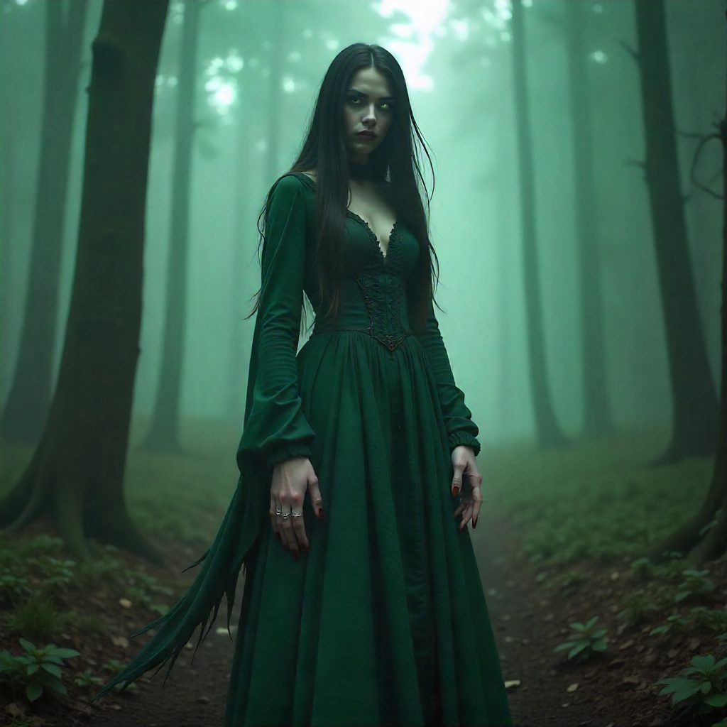 The Baobhan Sith is almost always described as breathtakingly beautiful, appearing as a young woman with pale skin, long flowing hair, and an otherworldly elegance that immediately draws attention. Their clothing is traditionally green, a colour strongly associated with fairy beings in Celtic belief, symbolising their connection to the Otherworld. This beauty is not incidental but essential to their survival, as it functions as the primary lure for unsuspecting victims.