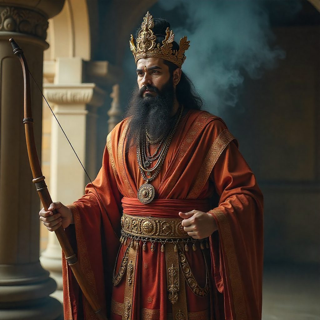 Yama’s appearance in Burmese tradition reflects his status as a divine prince whose virtues are revealed through his poise and serenity. In Yama Zatdaw performances, he is dressed in elaborate royal garments decorated with gold filigree, silk fabrics, and ornate jewellery typical of Burmese court attire. His crown, known as the mahālatā, marks his celestial lineage and highlights his role as a future king. While his physique signifies athletic ability, his overall portrayal is calm and composed rather than aggressive; the Burmese aesthetic prefers subtle strength over overt masculinity. His iconic bow symbolizes divine authority, and in classical dance movements his gestures embody patience, humility, and the inner discipline expected of an ideal ruler in both Hindu and Buddhist traditions.