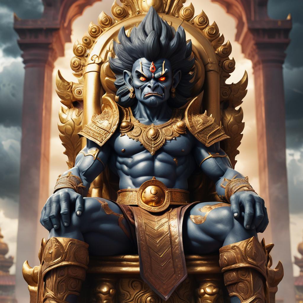 Ancient scriptures and artistic depictions describe Hiranyakashipu as a towering and awe-inspiring figure radiating golden brilliance. His name itself—Hiranya (gold) and Kashipu (soft bed)—implies not only his love for material wealth but also his opulent appearance. With a muscular frame, glowing eyes, and sharp features, he embodied strength and authority. His golden armor and crown symbolized his power, while his fierce expression reflected his inner rage and ambition. Legends recount that after performing his severe penance, his body became so radiant that it appeared to glow like molten gold. His very presence invoked terror among gods and mortals alike, a testament to his physical and spiritual might.