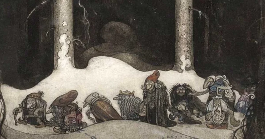 Descriptions of the Huldufólk vary across regions, but they are almost always portrayed as eerily similar to humans. They are said to be tall, slender, and exceptionally beautiful, often with dark hair and wearing simple, grey or green garments that blend seamlessly into Iceland’s rocky landscapes. In Faroese accounts, they are large in build, with black hair and somber expressions. One curious feature occasionally mentioned in Icelandic sources is their convex philtrum—the groove between the nose and upper lip—which distinguishes them subtly from humans.