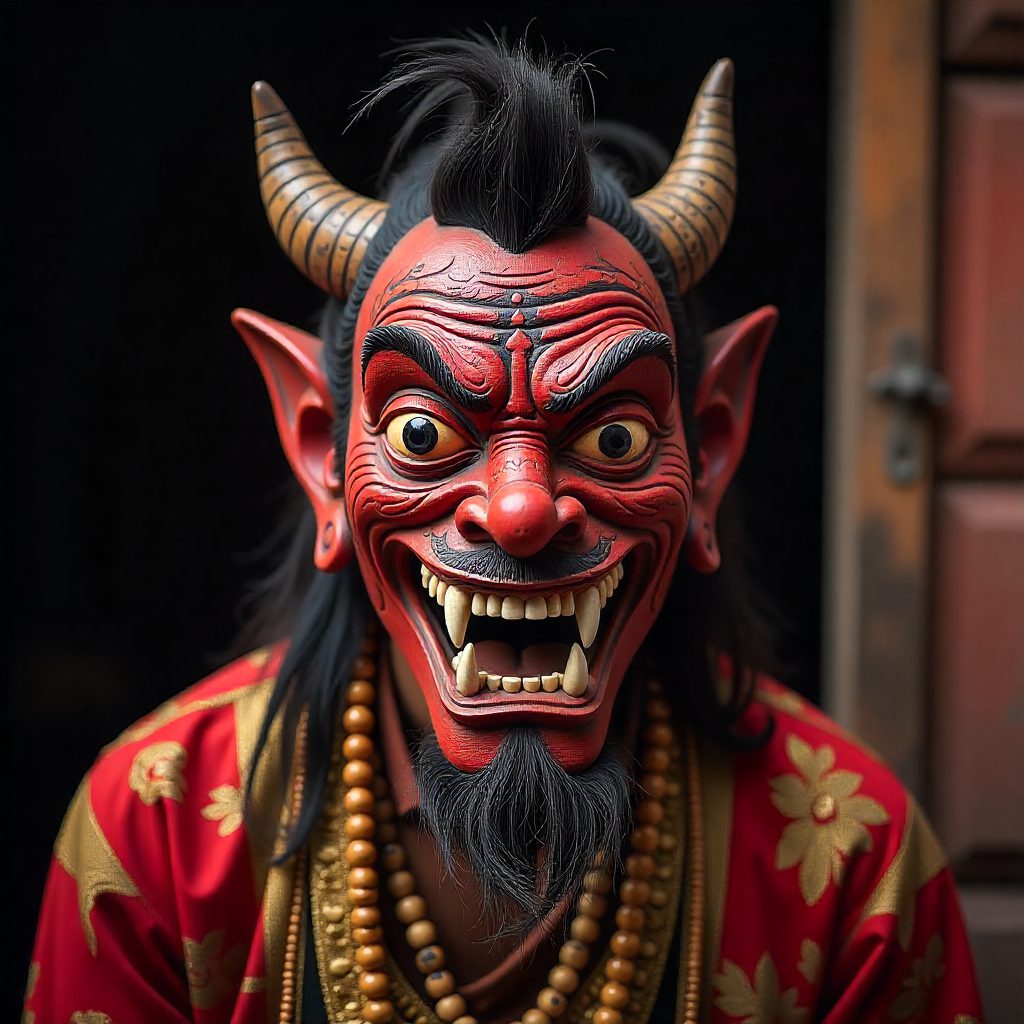 The physical portrayal of Lakhey is deliberately dramatic, designed to evoke both awe and apprehension. His mask is his most distinctive feature—large, vividly coloured, and crafted with exaggerated expressions. Bulging eyes, flaring nostrils, and sharp, protruding fangs dominate the face, while thick strands of wild red or black hair cascade around the mask, giving him a feral and unstoppable appearance. Traditional masks are carved from wood or moulded from clay and painted with meticulous detail, allowing each Lakhey to embody his own personality while keeping the core mythic identity intact. The costume complements the mask with layered garments that accentuate muscularity and movement. During dances, performers use powerful strides, sudden leaps, and sweeping gestures to capture the raw physicality of a demon whose presence is at once intimidating and protective. These movements reinforce Lakhey’s origin as a forest spirit yet also highlight his role as a guardian who watches over the city.