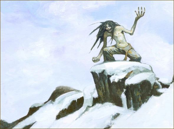 Most disturbingly, Mahaha maintains a constant, manic grin, its mouth stretched wide to reveal rows of needle-like teeth that gleam with anticipation—a sinister symbol of the creature’s twisted sense of humor and delight in its victims’ suffering. Despite inhabiting the frigid Arctic, Mahaha is always depicted barefoot, his feet toughened by the unforgiving terrain. Often described as naked or clad in tattered clothing, Mahaha appears impervious to the biting cold, further emphasizing his otherworldly existence beyond mortal concerns.