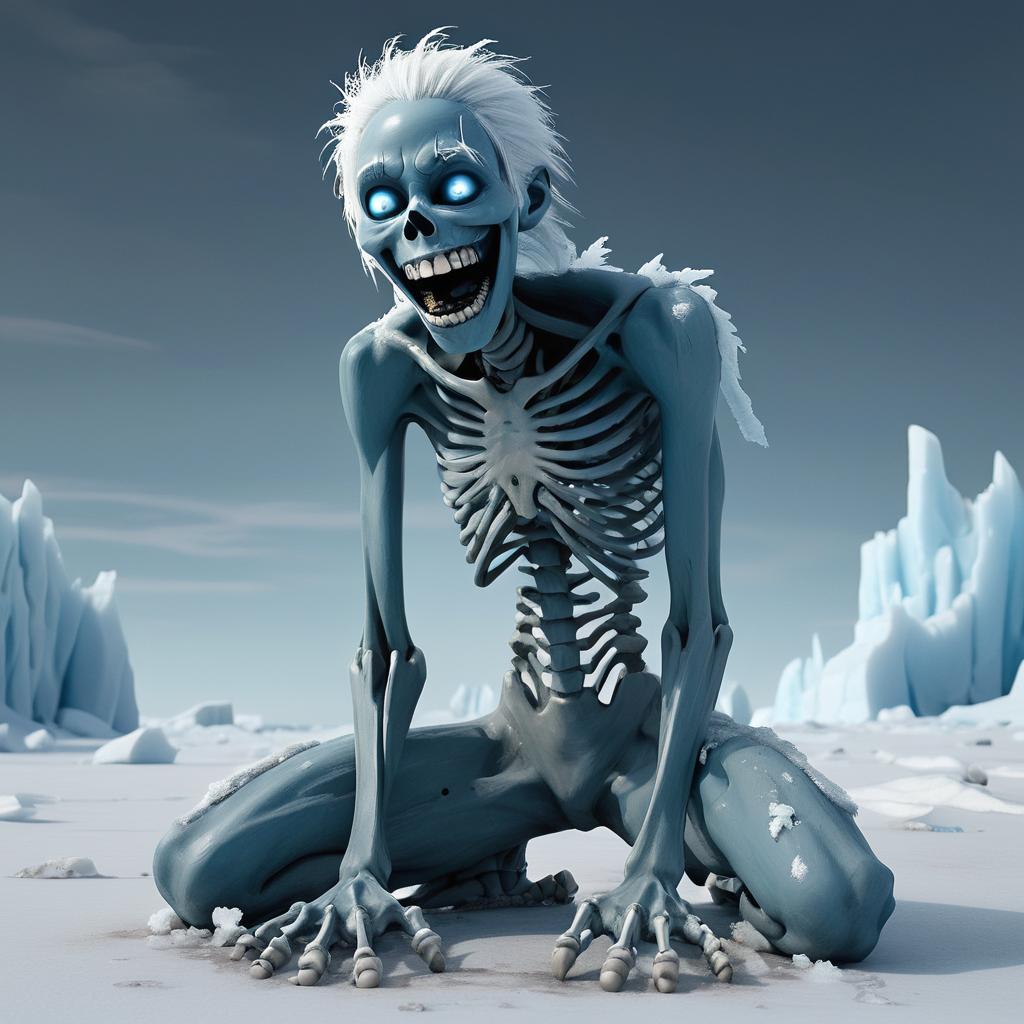 Mahaha is portrayed as a slender, gaunt figure, with pale, frostbitten skin reflecting the harsh Arctic environment. His face exhibits an elongated structure, bearing a perpetual unsettling grin that stretches across his lips. Despite his frail appearance, Mahaha emits an otherworldly aura, emanating an icy chill that freezes the hearts of those who encounter him. He is typically adorned in ragged furs, with piercing eyes glinting with a strange mixture of amusement and malice.