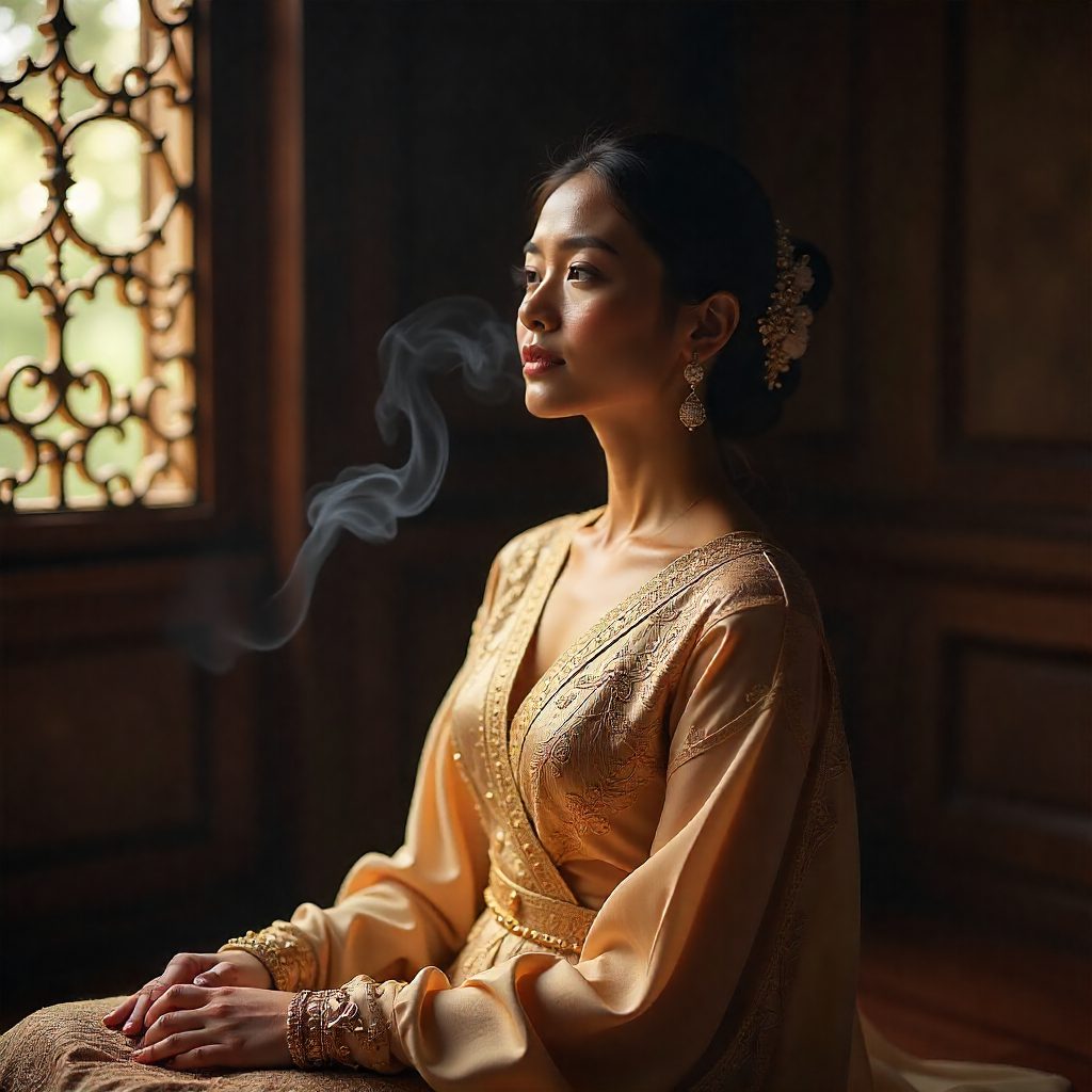 While traditional Indian sources describe Shanta with emphasis on her beauty and composure, the Malay narrative approaches her appearance with symbolic nuance. Instead of focusing on detailed features, Hikayat Seri Rama frames Shanta through her aura—serenity, intelligence, and inner radiance. These qualities reflect her name, which derives from the Sanskrit word for “peace,” and underscore her function as a figure of harmony amid the tensions that permeate the story. In Malay storytelling, outward beauty is presented less visually and more spiritually; Shanta’s elegance and calmness are referenced in relation to her lineage and character, reinforcing her status as a royal daughter whose presence commands both admiration and respect.