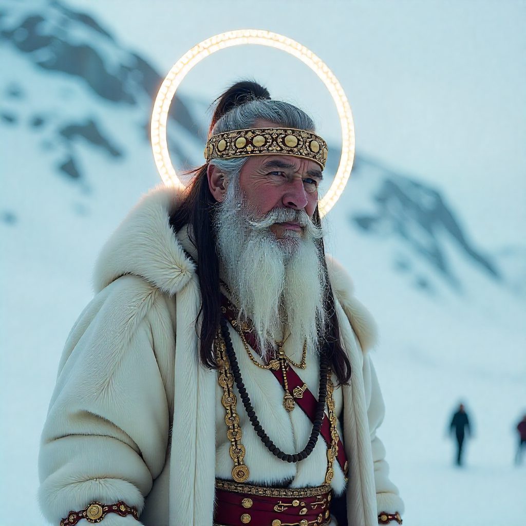 The descriptions of Urung Ai Toyon rarely rely on physical detail, reflecting his transcendent nature rather than human-like features. His essence is expressed through radiance—an overwhelming white brilliance that symbolizes purity, authority, and the unchanging laws of the Upper World. This luminous presence mirrors the sharp, reflective whiteness of the Yakut winter landscape, emphasizing his connection to the sky and celestial light. When depicted in Olonkho performances or traditional narratives, he may appear as a dignified elder robed in white, but even this is symbolic rather than literal. His form is intentional formlessness: vast, all-encompassing, and beyond corporeal boundaries. In Sakha spirituality, light is life, and thus the blinding brilliance of Urung Ai Toyon is the perfect expression of his supreme creative power.