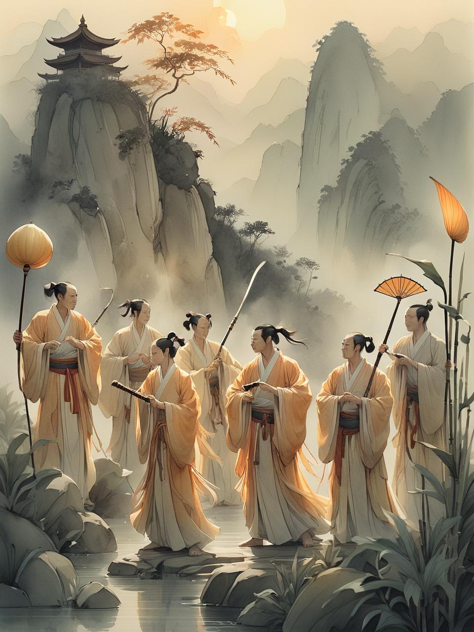 Seven legendary xian who bridge heaven and earth — mischief, miracles, and wisdom from Daoist lore.